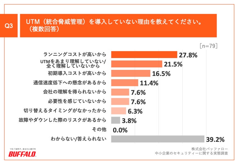 Q1で「UTM(統合脅威管理)」と回答しなかった方に、「Q3.UTM(統合脅威管理)を導入していない理由を教えてください。(複数回答)」(n=79)と質問したところ、「ランニングコストが高いから」が27.8%、「UTMをあまり理解していない/全く理解していないから」が21.5%、「初期導入コストが高いから」が16.5%、「通信速度低下への懸念があるから」が11.4% という回答となりました。