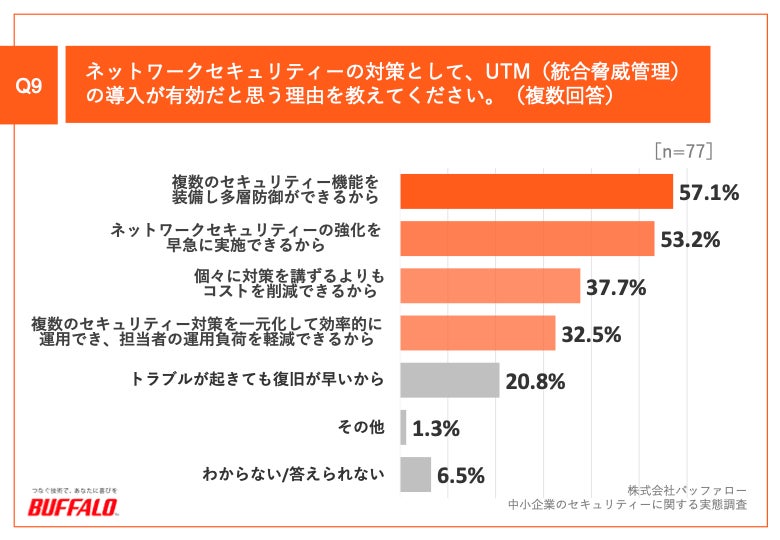 Q8で「非常にそう思う」「ややそう思う」と回答した方に、「Q9.ネットワークセキュリティーの対策として、UTM(統合脅威管理)の導入が有効だと思う理由を教えてください。(複数回答)」(n=77)と質問したところ、「複数のセキュリティー機能を装備し多層防御ができるから」が57.1%、「ネットワークセキュリティーの強化を早急に実施できるから」が53.2%、「個々に対策を講ずるよりもコストを削減できるから」が37.7%という回答となりました。