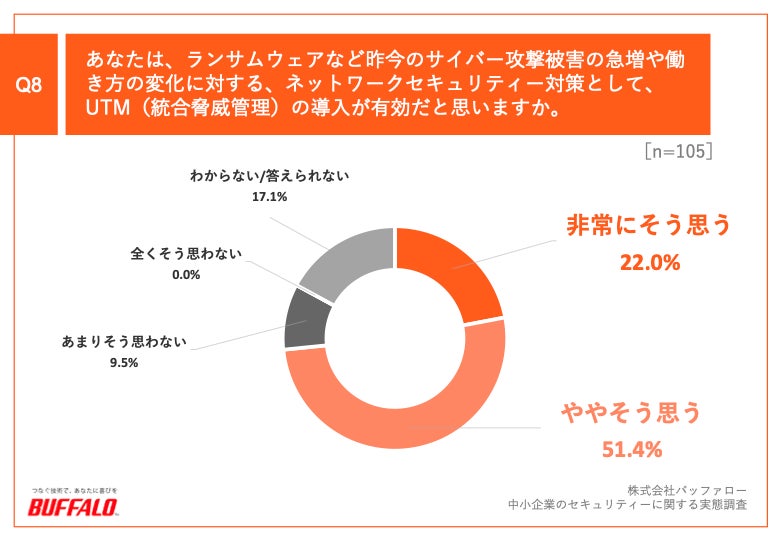 「Q8.あなたは、ランサムウェアなど昨今のサイバー攻撃被害の急増や働き方の変化に対する、ネットワークセキュリティー対策として、UTM(統合脅威管理)の導入が有効だと思いますか。」(n=105)と質問したところ、「非常にそう思う」が22.0%、「ややそう思う」が51.4%という回答となりました。