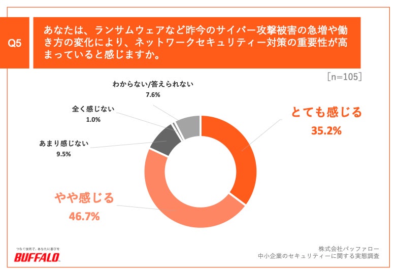 「Q5.あなたは、ランサムウェアなど昨今のサイバー攻撃被害の急増や働き方の変化により、ネットワークセキュリティー対策の重要性が高まっていると感じますか。」(n=105)と質問したところ、「とても感じる」が35.2%、「やや感じる」が46.7%という回答となりました。