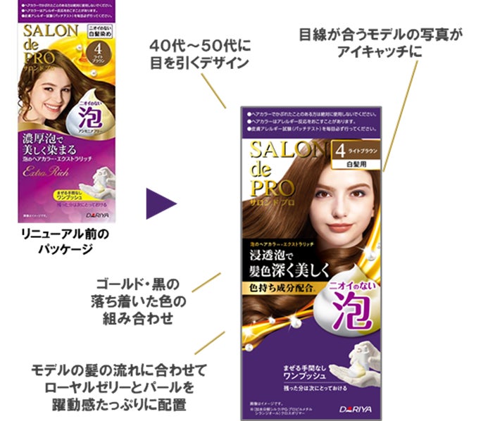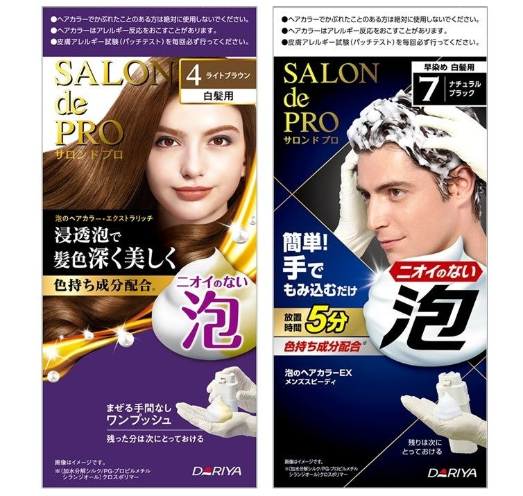 株式会社ダリヤ(本社:名古屋市中区、代表取締役社長:野々川 純一)が展開する、ニオイのない※泡タイプの白髪染め「サロン ド プロ 泡のヘアカラー・エクストラリッチ」(女性用)と「泡のヘアカラーEX メンズスピーディ」(男性用)がリニューアル!毛髪への浸透力を追求した“新・浸透泡”が、染料を素早く髪の内部へ届けます。また、色持ち成分を配合。パッケージも新しくなりました。混ぜる手間なく必要な分だけ出して塗れるのもポイント。残った分は次にとっておけます。ニオイのない※快適な使い心地をぜひお試しください。※頭皮や肌についた場合、反応臭がすることがあります。