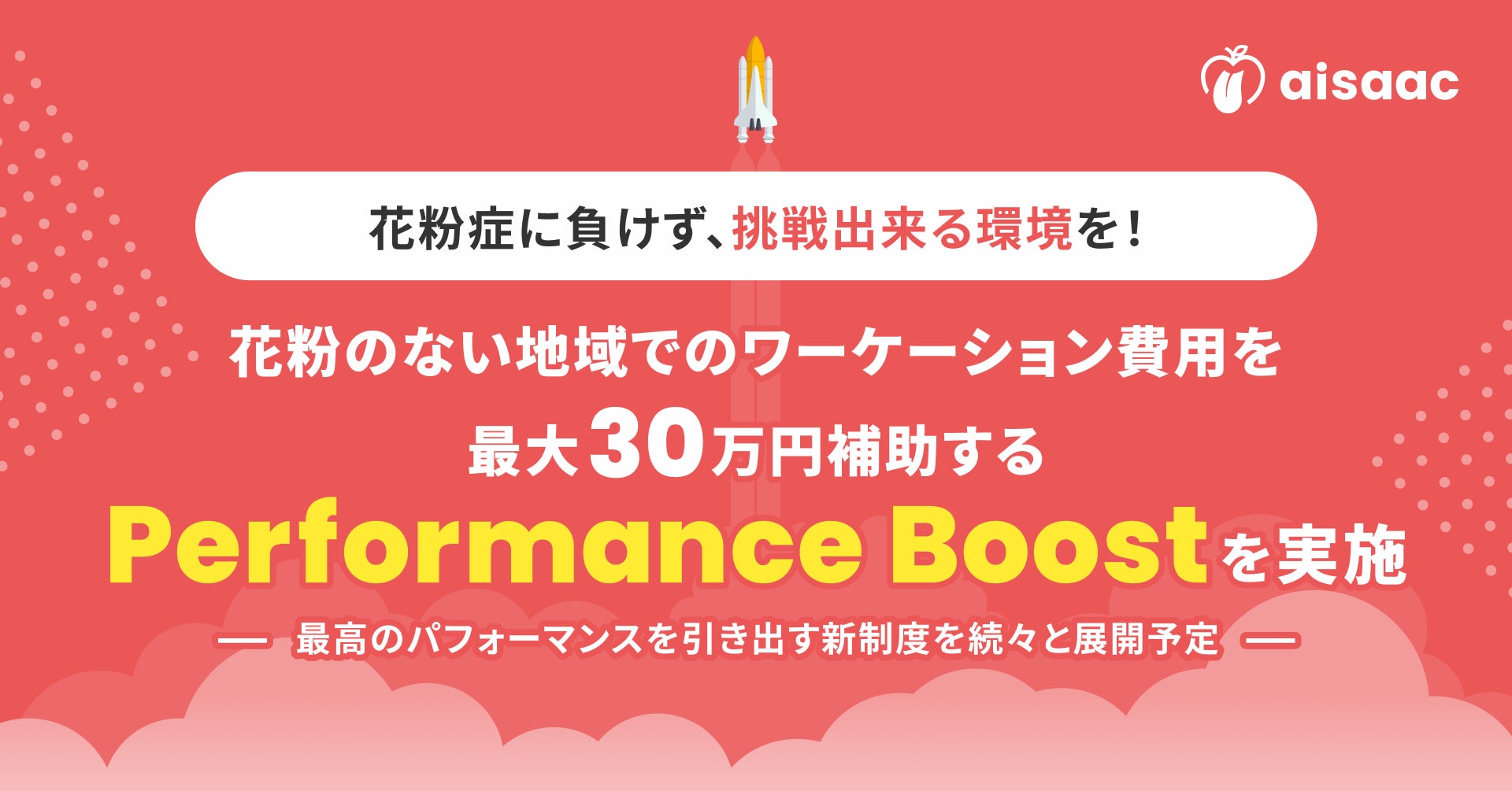 アイザック株式会社(本社:東京都渋谷区、代表取締役社長:田中和希、以下アイザック)は、メンバーの挑戦を加速させる「Performance Boost(旧Tropical Escape)」制度を2025年も実施いたします。本制度は、メンバーの挑戦を後押ししたいと、季節的要素に左右されない安定した高パフォーマンス環境の提供を目指す取り組みの一つで、花粉のない地域でのワーケーション費用を最大30万円補助するものです。