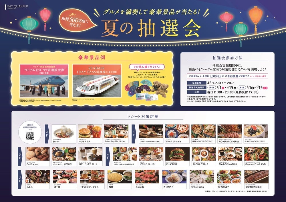 ベトナム航空で行くベトナム往復航空券やシーバス乗車優待券、ベトナム刺繍のポーチや扇子、さらに「横浜ランタンナイト」限定オリジナルノベルティグッズなど豪華景品が総勢500名様に当たる抽選会を開催。期間中に館内の対象飲食店をご利用いただくと、税込5,000円につき1回抽選にご参加いただけます。