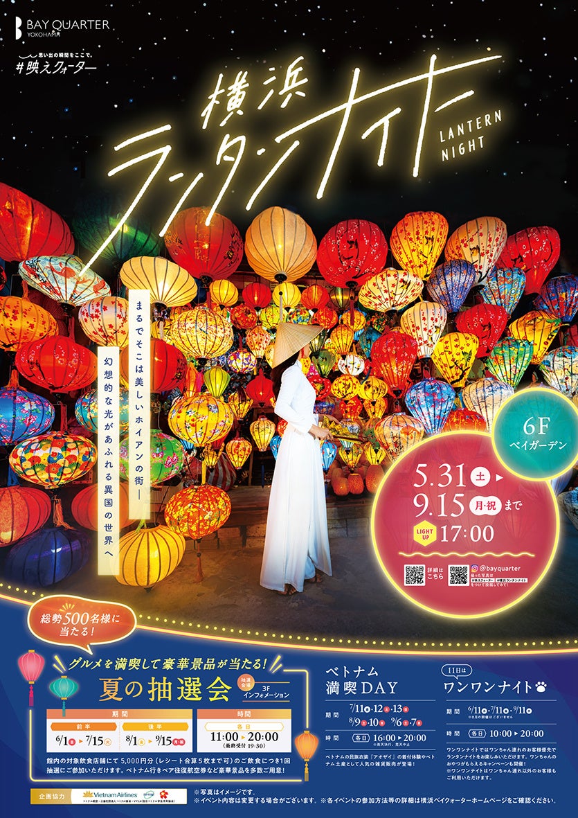 2019年より好評を博し、横浜の夏の新たな風物詩として注目を集めている本イベント。今年は「おとなりゾート。」という当施設のコンセプトのもと、まるで海外に出かけたような特別な空間へ進化します。過去最大数となる多彩な色や形のランタンを中心に、ベイガーデン全体に幻想的な古都ホイアン旧市街の街並みを再現。ベトナム・ホイアンのランタン売りの屋台をイメージしたフォトスポットなど多数登場します。さらに今年は、ベトナム航空やVYSA(在日ベトナム学生青年協会)にもご協力いただき、ベトナムへの往復航空券が当たる抽選会や、ベトナムの伝統衣装「アオザイ」を着て撮影やショッピングが楽しめるイベントなど、多彩な企画をご用意しています。