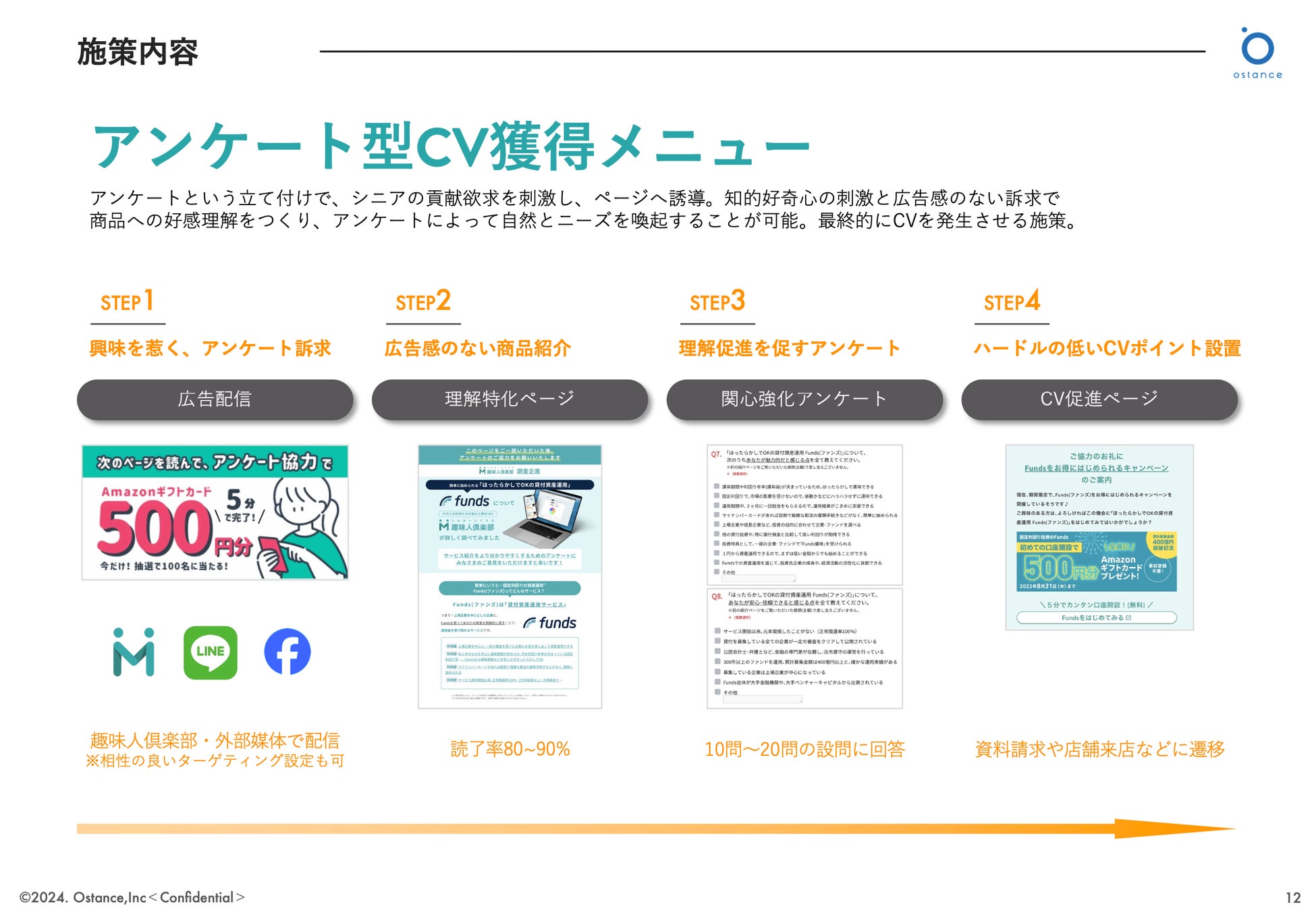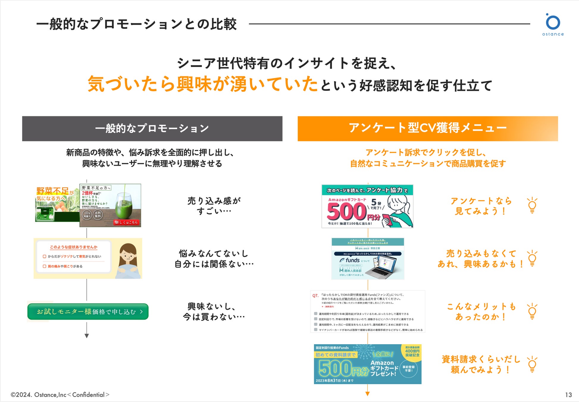 また、一般的な商品訴求や悩み訴求ではなく、アンケート訴求でシニア世代と接触を図るため、本来ならアプローチできなかった潜在層がページに来訪し、興味づけを促し、CVを狙うことができます。