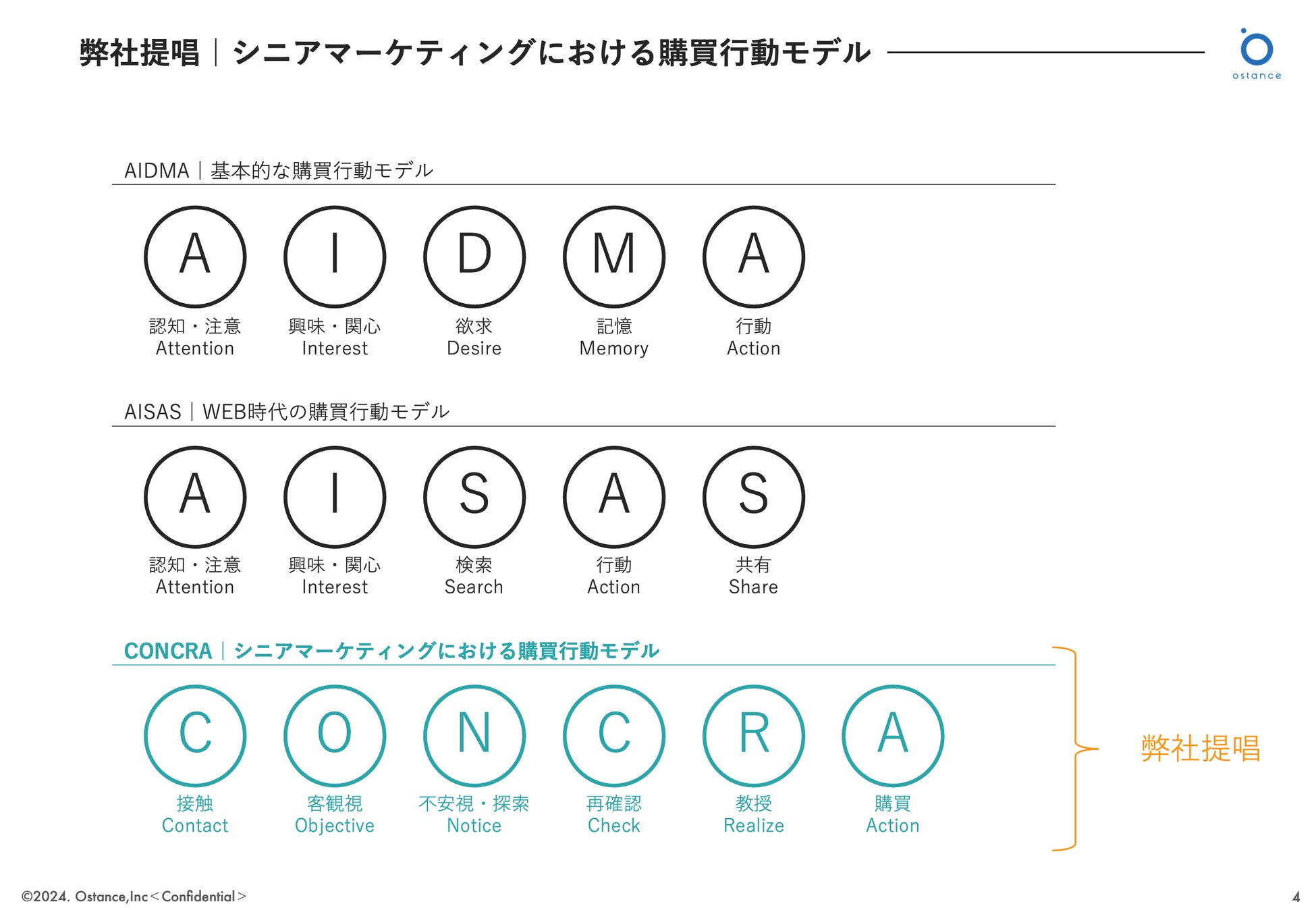 シニア世代は、他世代と比べて広告への抵抗感が強く、商品情報と接触する「Contact(接触)」のコミュニケーション設計が鍵となります。弊社では年間300件以上のシニア向けデプスインタビューや、企業様とのシニア向け新規事業・マーケティング支援プロジェクトの知見を生かし、シニアマーケティングにおける購買行動のフレームワーク「CONCRA」を提唱しています。