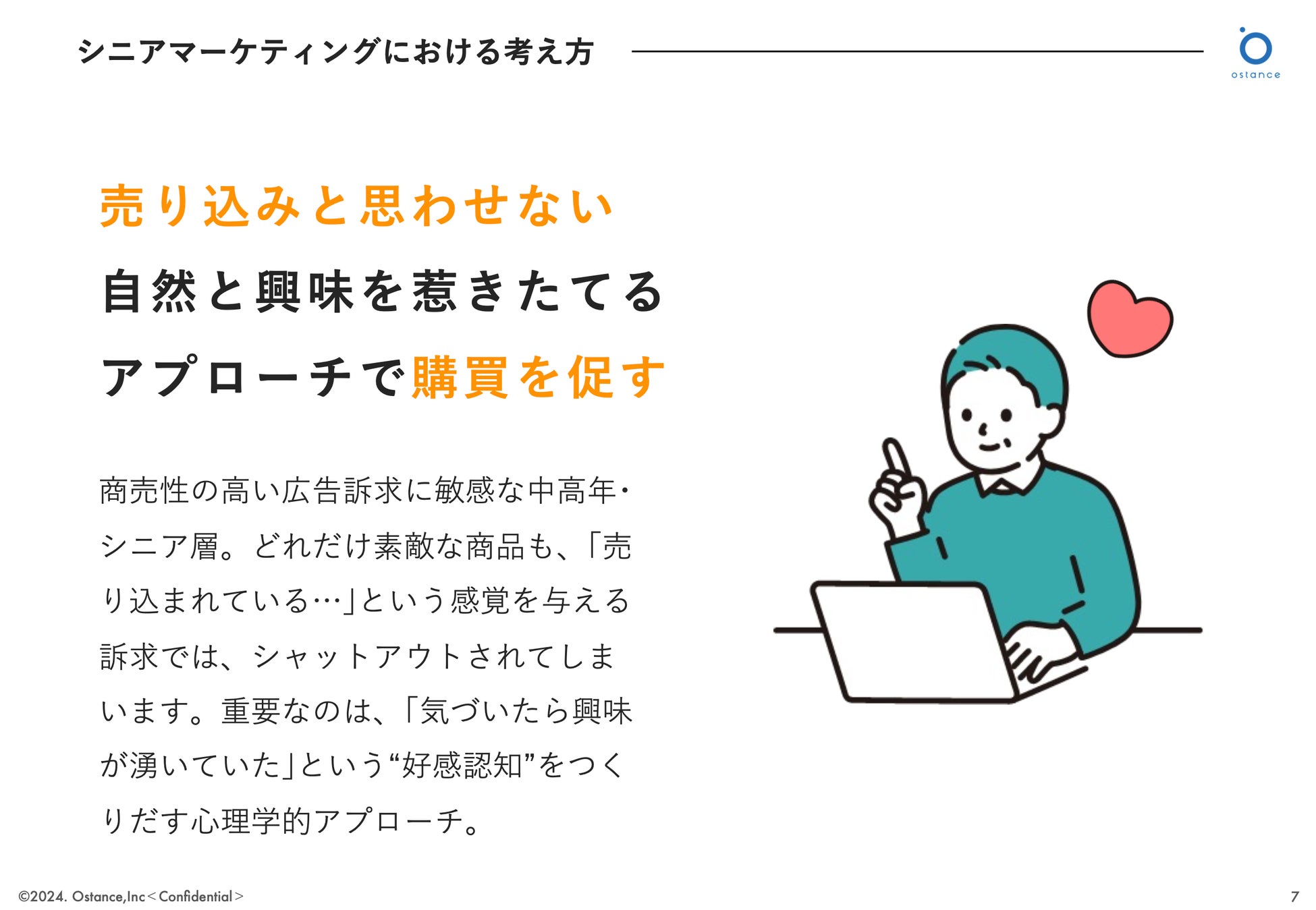 シニアマーケティングにおいて、シニア世代特有の購買ハードルの高さや、初期接触時のコミュニケーション設計ハードルを考慮し、「気づいたら興味が湧いていた」という「好感認知」を得ていくことが重要です。