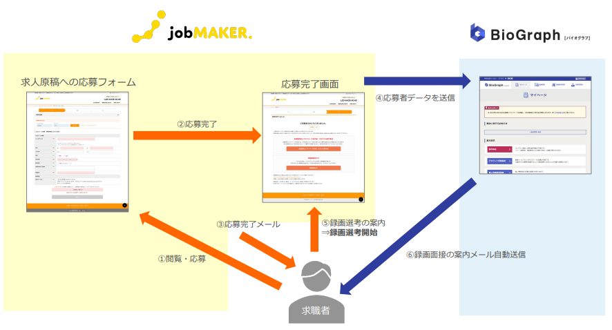 WEB面接サービス「BioGraph」は、求人・採用サイト構築サービス「jobMAKER」の求人応募フォームとデータ連携を行います。これにより、以下のようなフローを実現します。