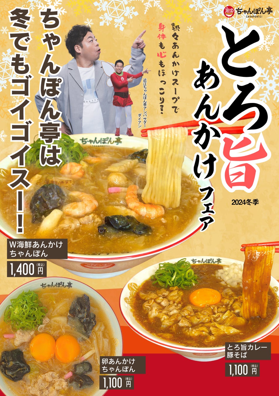 冷えた身体を芯から癒してくれる「2024冬季 とろ旨あんかけフェア」。近江ちゃんぽん亭が自信を持ってお届けする冬限定の贅沢なメニューを、ぜひお近くの店舗でお楽しみください。