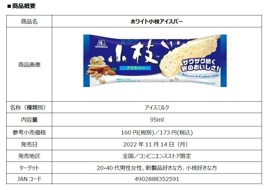 森永製菓株式会社(東京都港区芝、代表取締役社長・太田 栄二郎)は、ロングセラー商品チョコレート「小枝」をイメージしたアイス「ホワイト小枝アイスバー」を11月14日(月)から新発売いたします。
