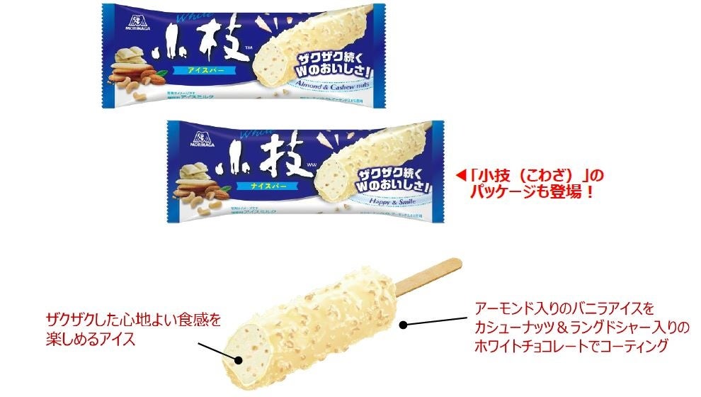 アーモンド入りのバニラアイスをカシューナッツ&ラングドシャー入りのホワイトチョコレートでコーティングし、ザクザクした心地良い食感を楽しめるバータイプのアイスです。「小枝」ならではの、具材とチョコの絶妙なコンビネーションをアイスで表現しました。また、「小枝」発売50周年で話題となりました、商品ロゴのデザインが『小枝』ではなく、『小技(こわざ)』になっているパッケージも登場予定です。「小枝」をイメージしたアイスの新商品発売で話題を喚起し、 ますますアイス市場を盛り上げてまいります。