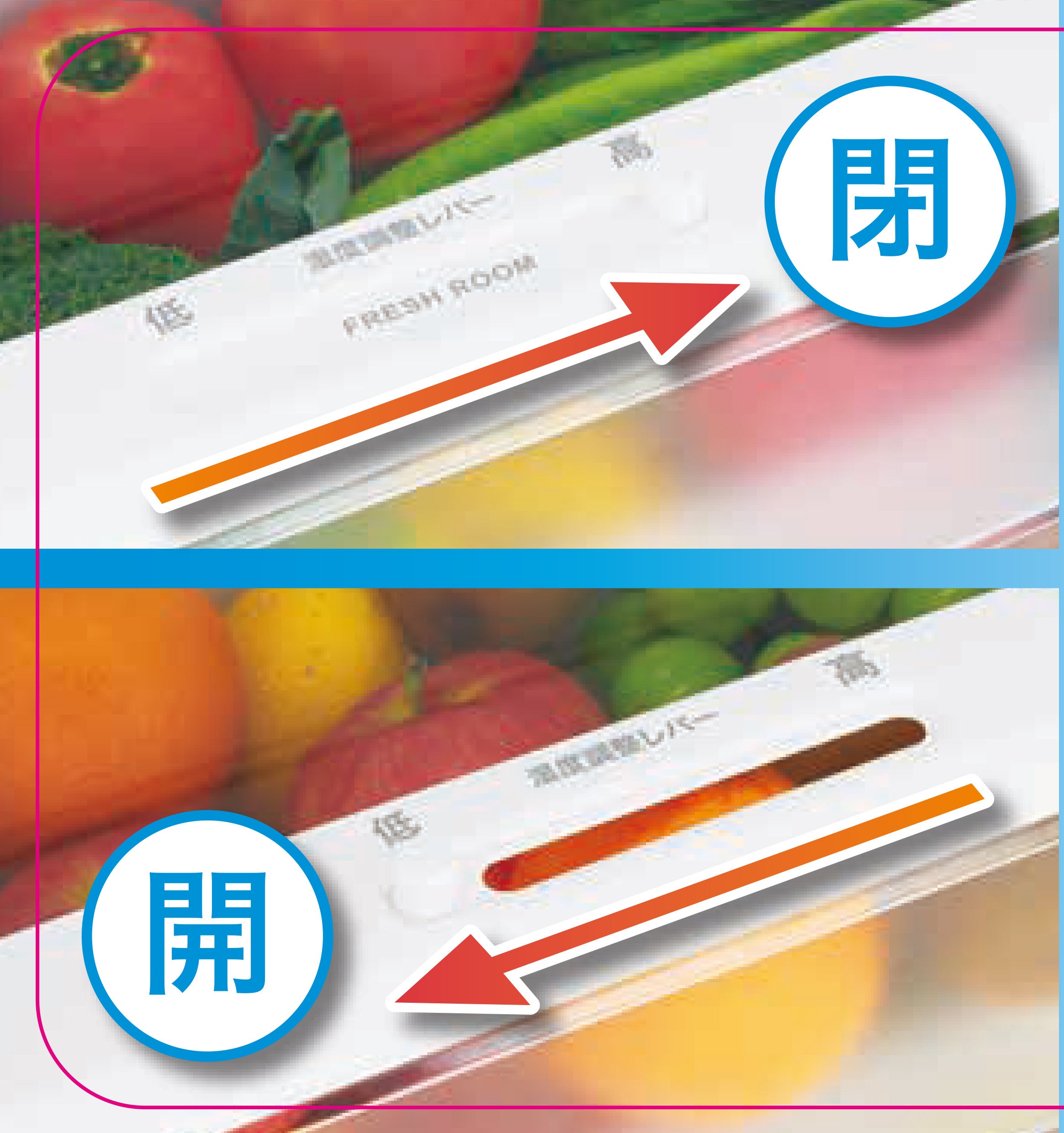 ②レバーの開け閉めで湿度調整ができる野菜ケース③肉や魚の鮮度を長持ちさせるチルドルーム