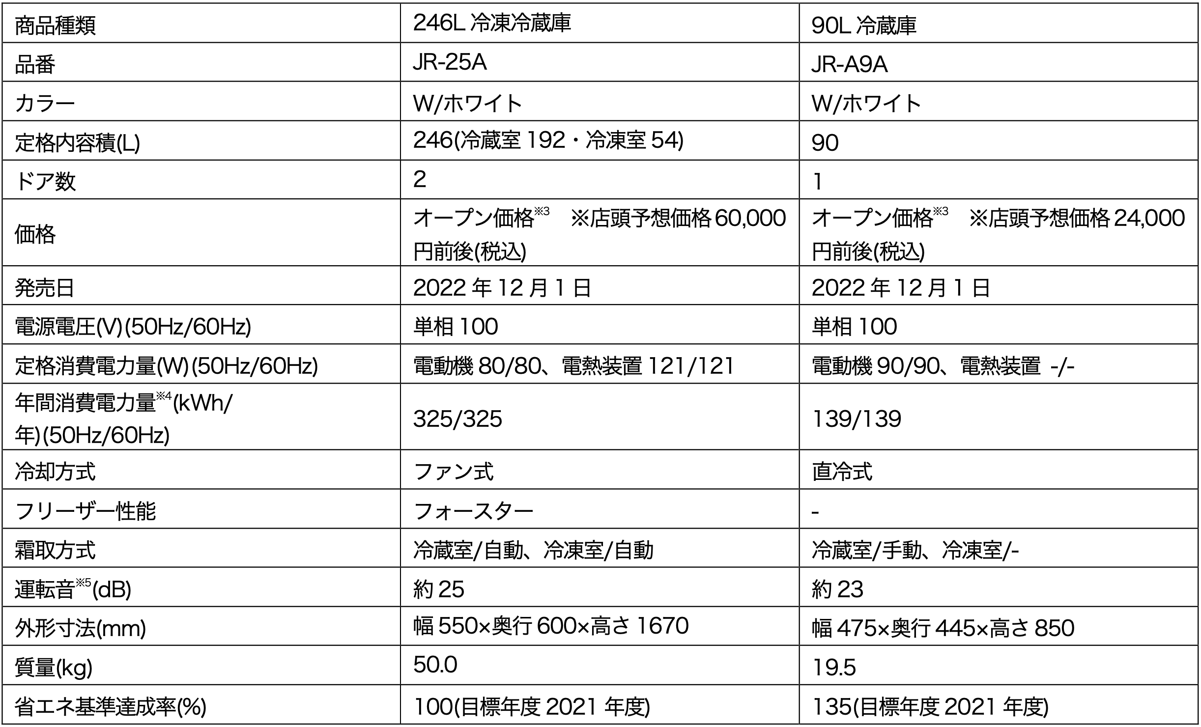 246L冷凍冷蔵庫(JR-25A)・90L冷蔵庫(JR-A9A)の概要は以下の通りです。