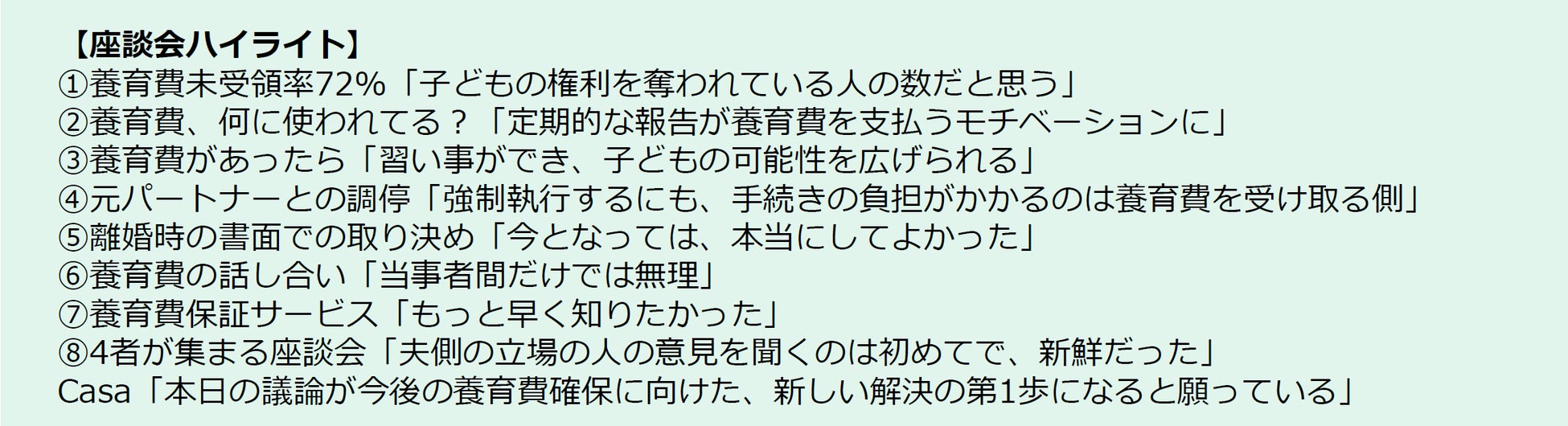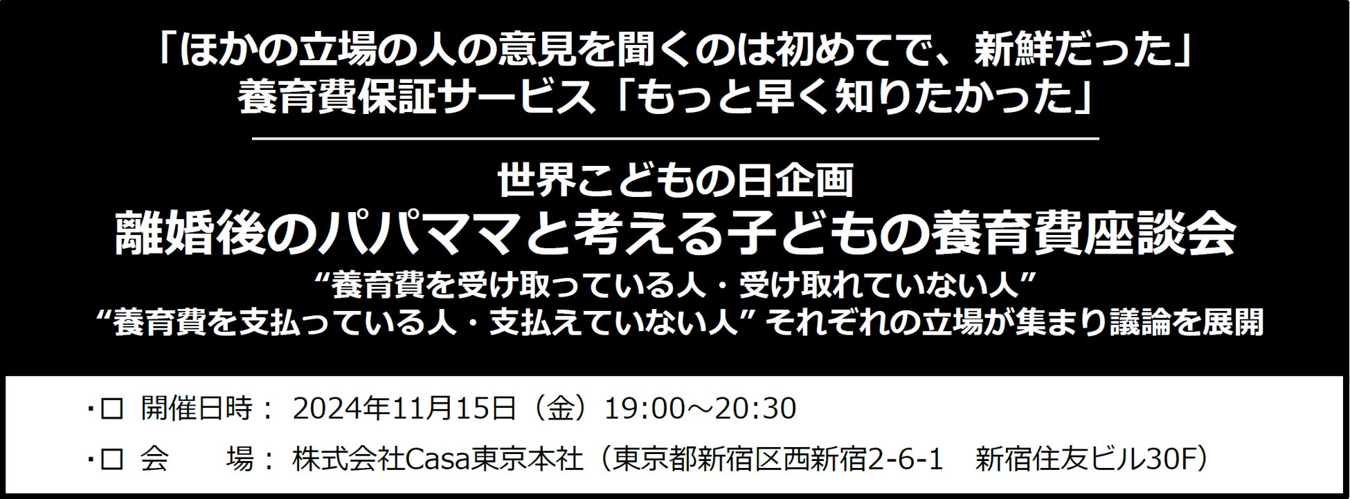 養育費保証サービス「養育費保証PLUS」を運営する株式会社Casa(本社:東京都新宿区、代表取締役社長:宮地正剛)は、11月20日に国際記念日として制定されている「世界こどもの日」に先立ち、11月15日(金)『離婚後のパパママと考える子どもの養育費座談会』を開催いたしました。