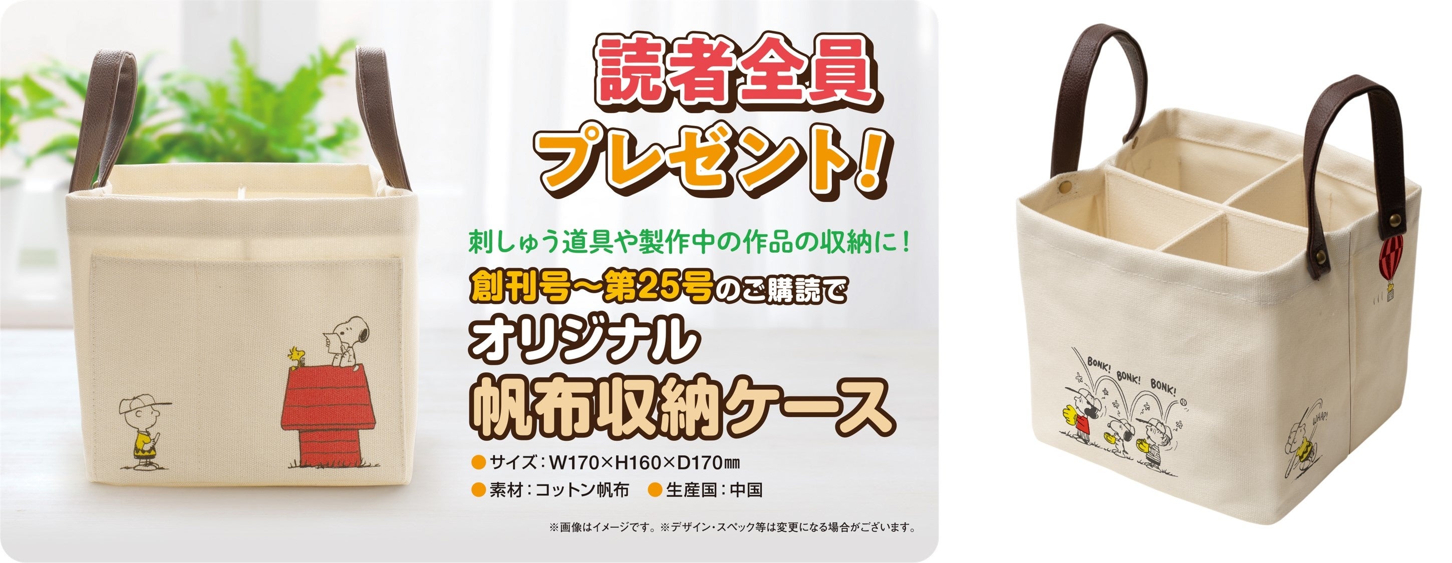 創刊号~第25号までのご購読で「帆布収納ケース」を読者全員にプレゼントいたします。制作途中のキットを保管することもできる、便利でかわいいオリジナルアイテムです。