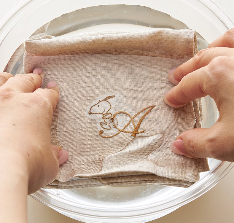 最後にお湯につけるとペーパーが溶けてなくなり、刺しゅうが完成します。