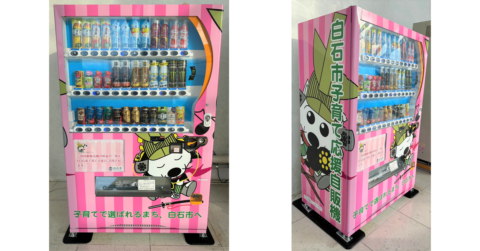 この取り組みの一環として、白石市子育て応援自動販売機(以下、本自販機) を、9月19日(火)に、白石市文化体育活動センター(ホワイトキューブ)等に設置いたしました。白石市PRキャラクター「ポチ武者こじゅーろう」のイラストが施された本自販機は、収益金の一部が白石市に寄付され、市内の子育て関連施設の活動費に役立てられます。