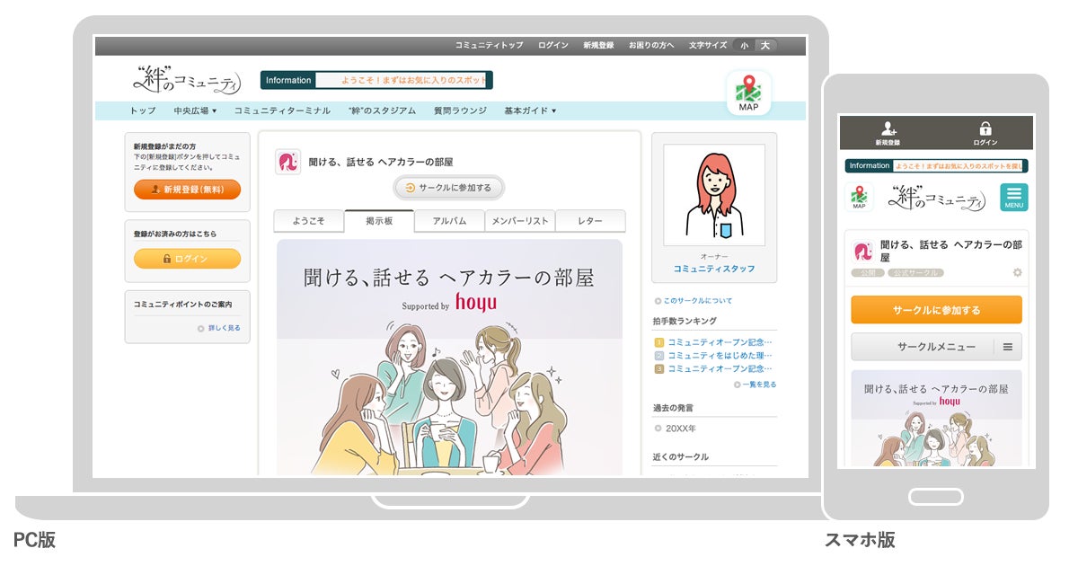 「聞ける、話せる ヘアカラーの部屋 Supported by hoyu」が開設された「“絆”のコミュニティ」は、2020年1月にオープンした、クオンが運営するオンライン上のファンコミュニティプラットフォームです。60以上の企業・自治体と200万人を超える生活者が集い、“絆”をテーマにした交流や、参画企業・団体のコラボレーション企画、双方向コミュニケーションから生まれる生活者の声をもとにした価値共創のイベントなどを実施しています。https://www.beach.jp/community/KIZUNA/
