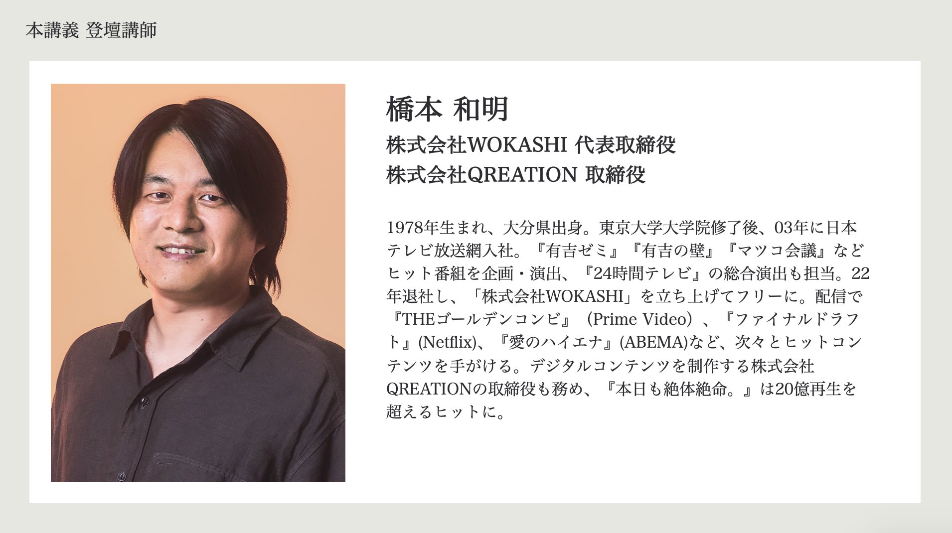 日本テレビにて『有吉ゼミ』『有吉の壁』『マツコ会議』などヒット番組を企画・演出し、フリーとして独立後も配信で『THEゴールデンコンビ』(Prime Video)、『ファイナルドラフト』(Netflix)、『愛のハイエナ』(ABEMA)など、次々とヒットコンテンツを手がける橋本和明氏。デジタルコンテンツを制作する株式会社QREATIONの取締役も務め、『本日も絶体絶命。』は20億再生を超えるヒットを生むなど、注目を集めるクリエイター/プロデューサーです。