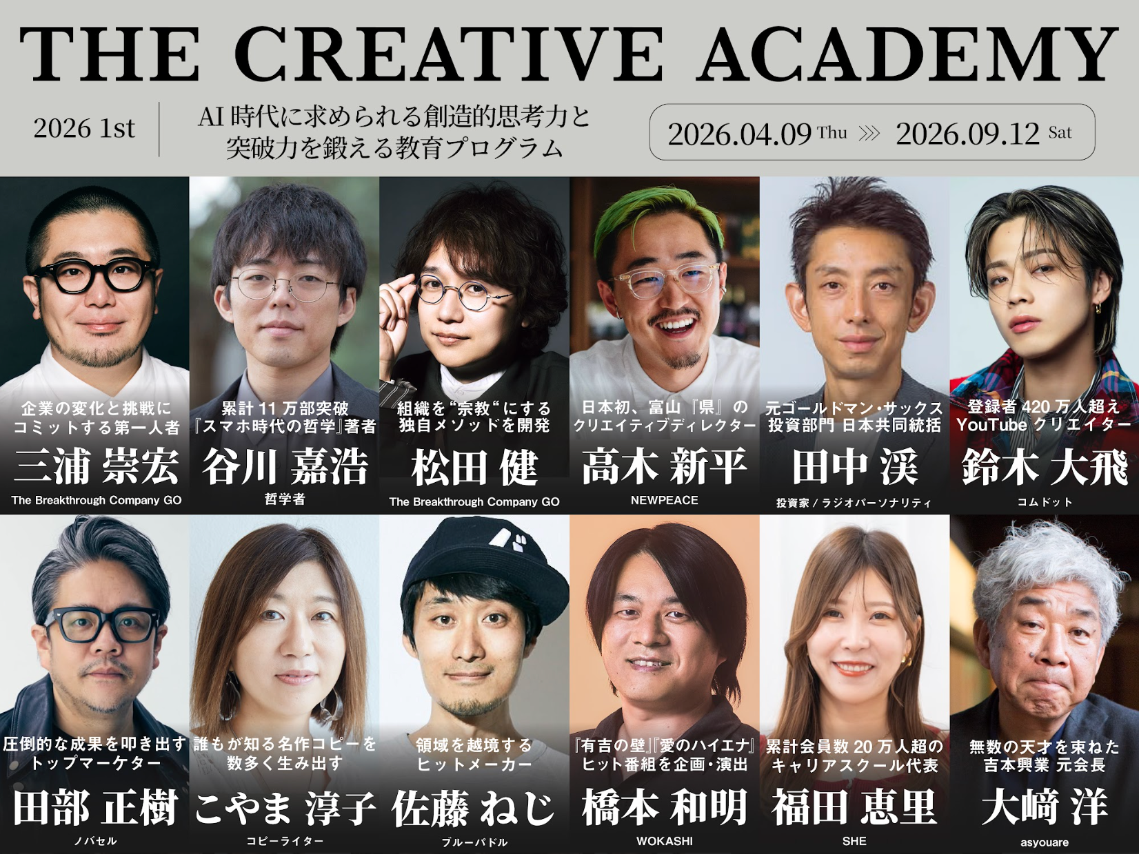 「THE CREATIVE ACADEMY 2026 1st」に、テレビ業界の大物が参画。『有吉ゼミ』『愛のハイエナ』の企画・演出を手掛ける橋本和明氏、元・吉本興業会長の大﨑洋氏が講師に追加決定