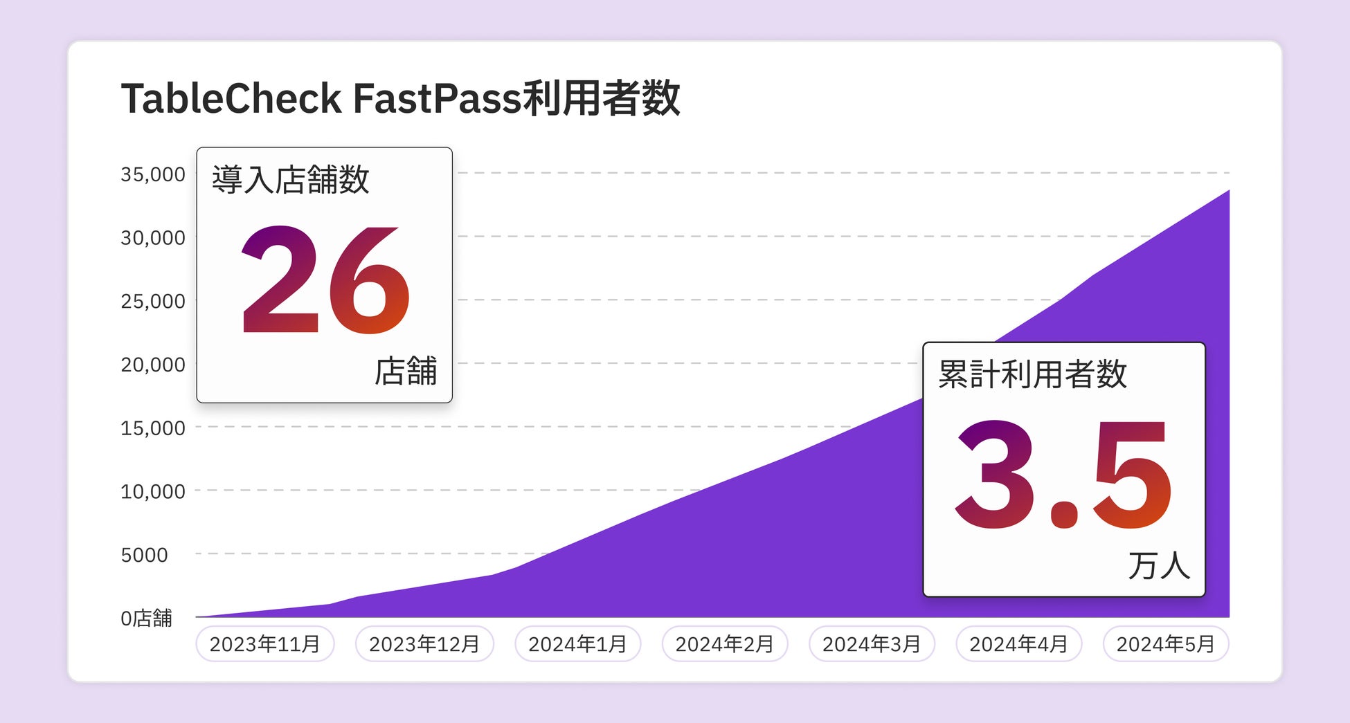 現在は国内の行列のできる人気店26店舗に導入いただき、先行導入が開始された2023年11月1日から2024年5月31日までに累計3.5万人のゲストに「テーブルチェック ファストパス」をご利用いただきました。日本滞在の時間が限られた訪日客の需要にもマッチし、訪日客の利用割合は全体の約2割と高い傾向にあります。今後も地域や業態を問わず、全国の人気店300店舗への導入を目指しています。