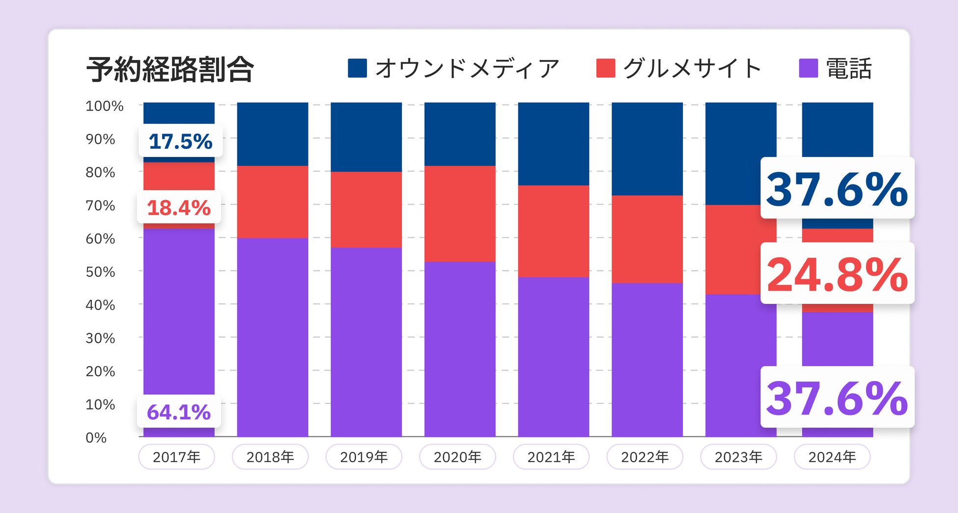 また、飲食店の予約が「電話」から「ネット予約」へと移行している様子が、当社のデータに顕著に表れています。さらに、ネット予約の中でも、送客手数料がかかるグルメサイトではなく、顧客とダイレクトにつながることができるテーブルチェックが提供するオウンドメディア(公式ウェブサイト)からの予約の割合が近年高まり続けていることも見えてきました。2024年5月末時点の集計では、約4割がオウンドメディア経由の予約となっており、2017年の2倍以上の割合にまで拡大しています。