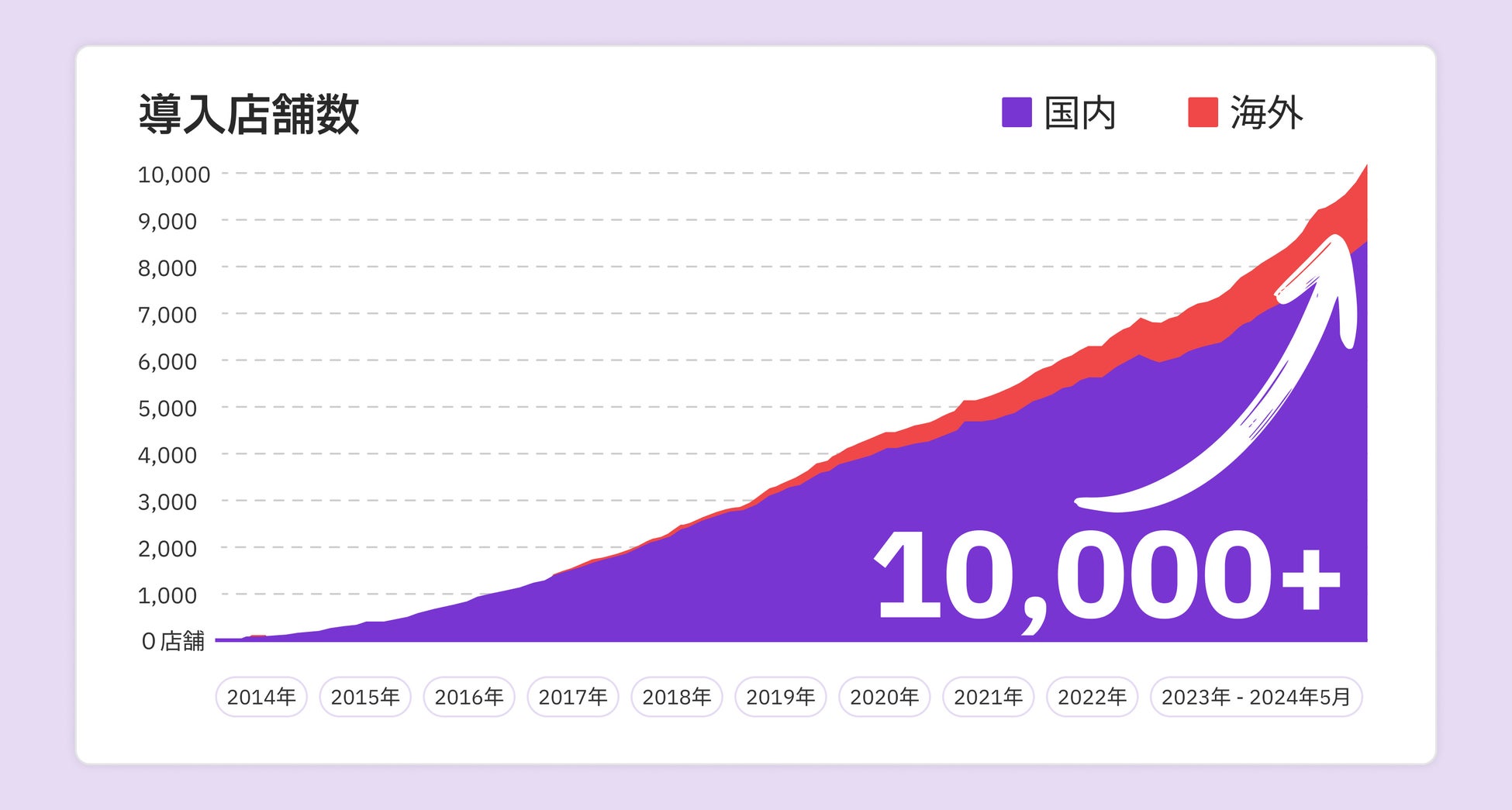 テーブルチェックの予約・顧客管理システムは、2013年10月の提供開始以来、国内外の多くの飲食店にご活用いただいてまいりました。このたび、2024年5月末日時点で、導入店舗数が初めて1万店舗を突破し、10,143店舗になりました。導入店所在地は世界35か国・地域に広がっており、海外の導入店舗数割合も全体の約15%にまで成長しました。
