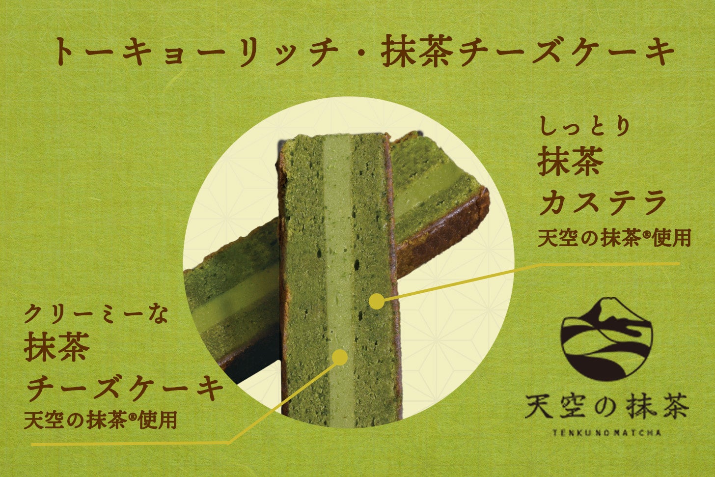 5年ぶりとなる新作は、新緑の季節にぴったりな抹茶フレーバー。クリーミーに仕上げた抹茶チーズケーキを、しっとり食感の抹茶カステラでサンドし、じっくりと焼き上げました。カステラとチーズケーキには、静岡県の山間地域で栽培された程よい苦みと上品な香りが特徴の【天空の抹茶®︎】を贅沢に使用。豊かに広がる抹茶の香り、奥深い甘みと程よい苦み、さらに濃厚な抹茶チーズのくちどけをお楽しみいただけます。