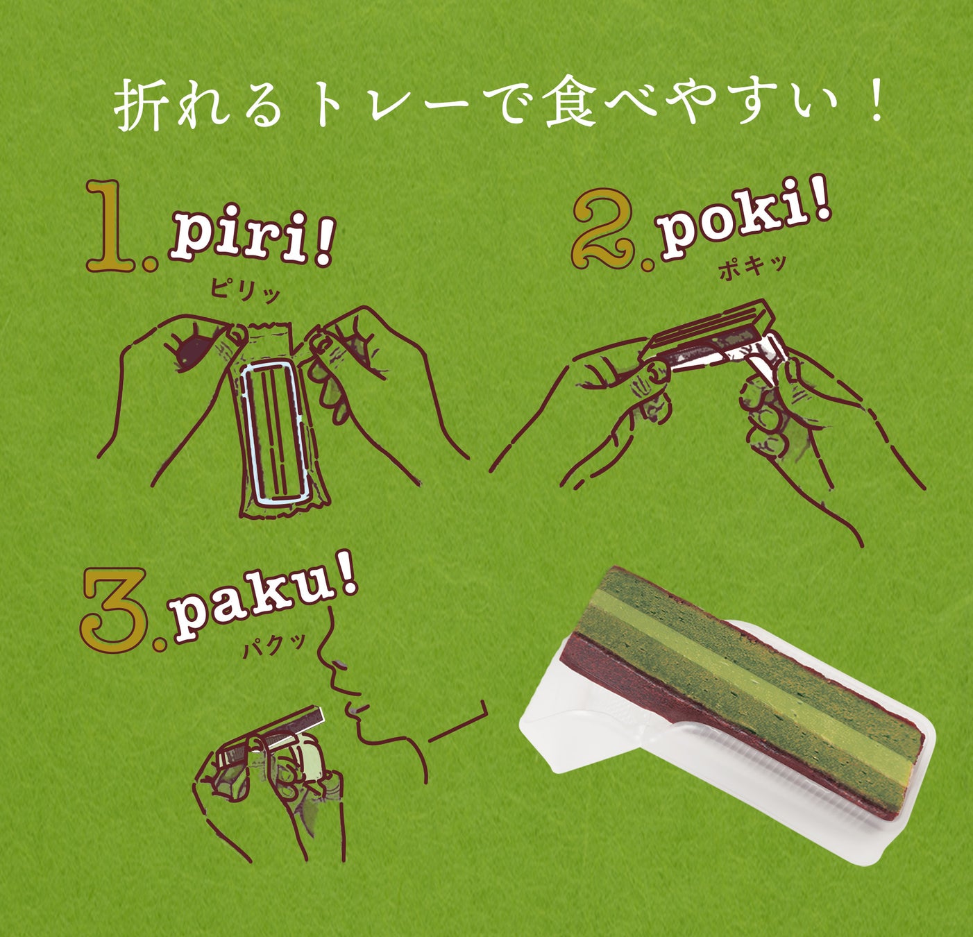 またどこでもどんな時でも食べられるように、先端が折り曲げられるトレーを採用。すぐに手洗いやアルコールができない状況でも商品に触れることなくお召し上がりいただけます。