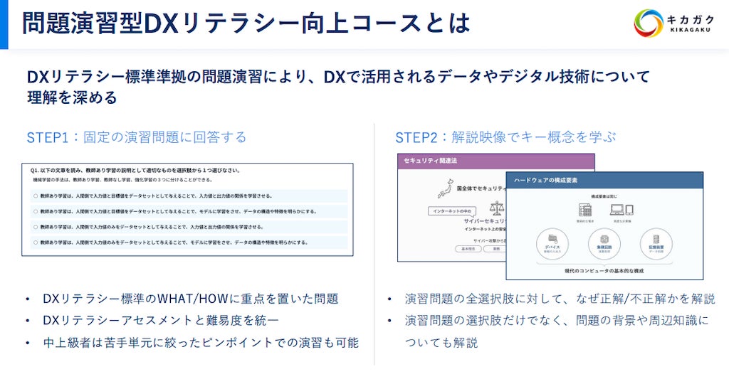 受賞対象となった「キカガク for Business」について、2024年9月からのアップデートにおいてアセスメント結果と連動し効率的な学習を可能にするeラーニング「問題演習型DXリテラシーコース」や、一部のeラーニングにおいて生成AIとの対話を通じて思考を深めるインタラクティブな学習体験を実装。