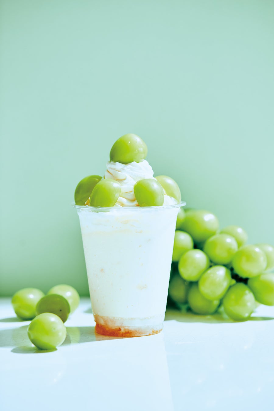 コロンビア産のホワイトチョコレートを使用したフローズンドリンク。底にはシャインマスカットの自家製ピューレを敷き、シャインマスカットを贅沢にトッピングしました。