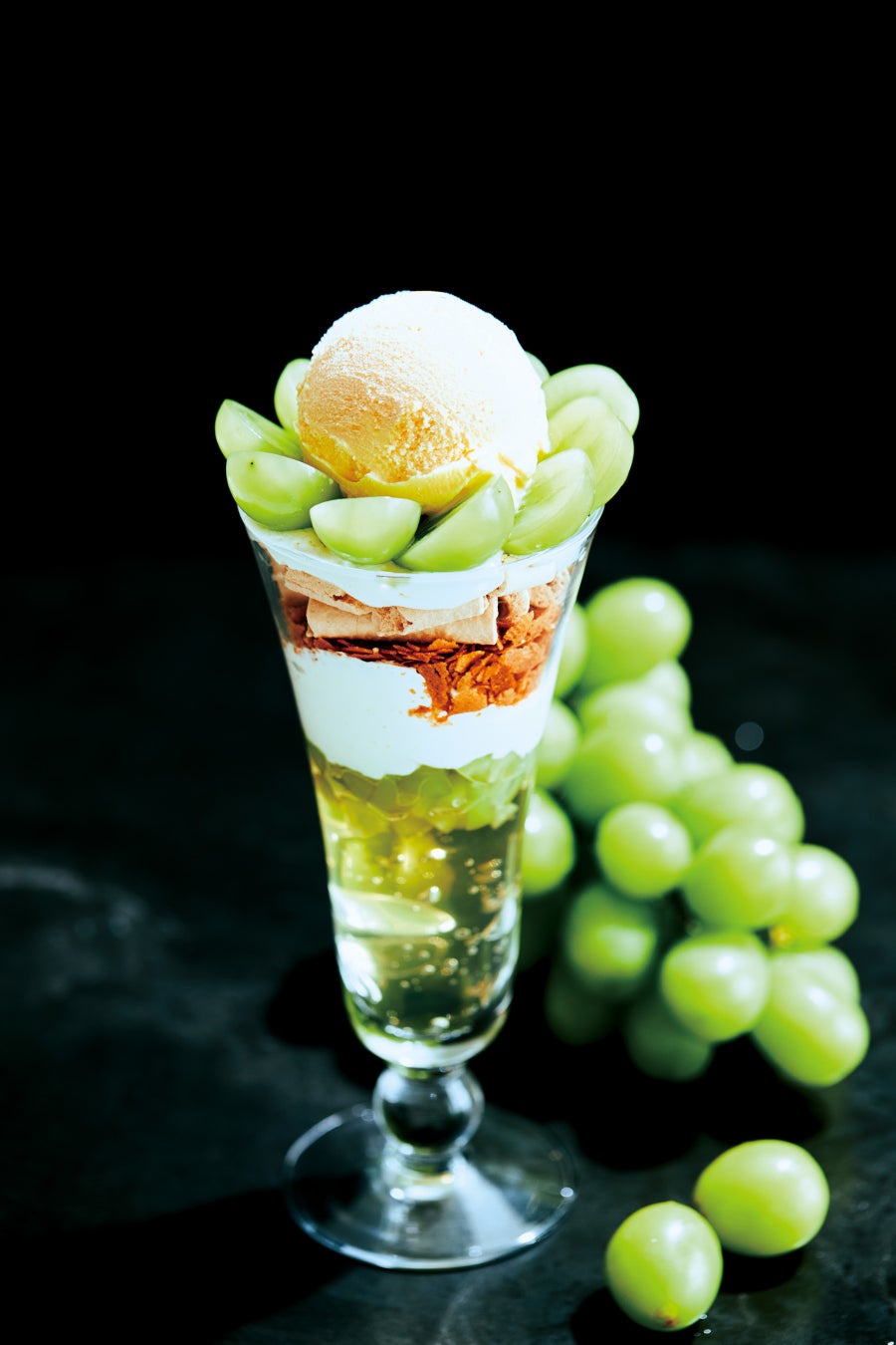 下から白ワインとカカオのフルーツビネガーを合わせたゼリー、フレッシュなシャインマスカットの果肉、カカオのフルーツビネガーで作ったシャンティクリーム、食感にフィアンティーヌと自家製のメレンゲを重ね、トッピングにエルダーフラワーのアイスクリームと大粒のシャインマスカットを飾りました。