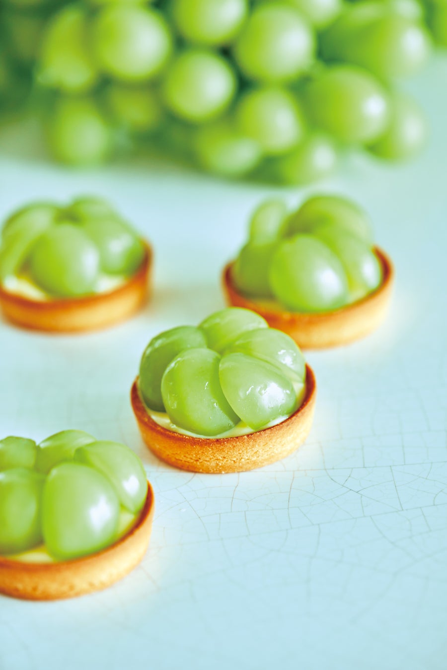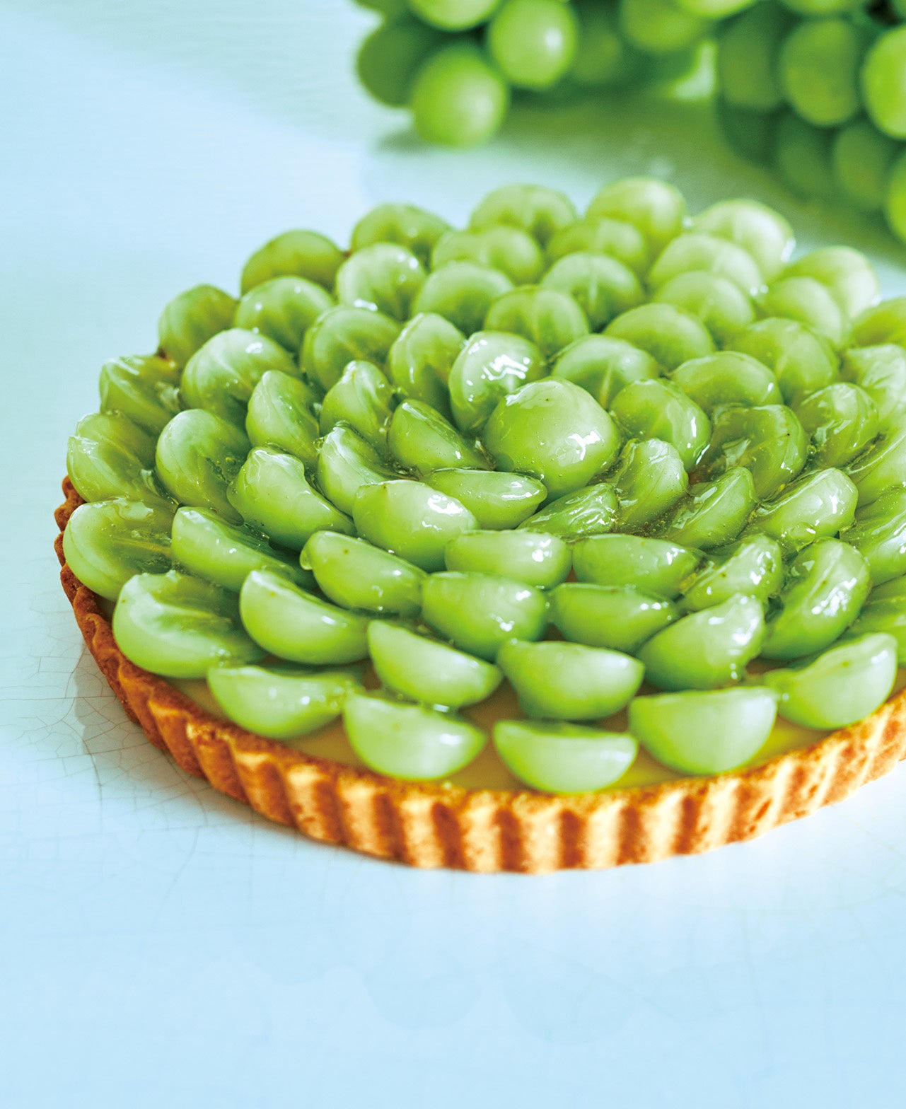手焼きのタルトの中に、コロンビア産のキレの良いホワイトチョコレートとヨーグルト、マスカットの果汁を合わせた滑らかなクリームを絞り、上には大粒のシャインマスカットを敷き詰めました。