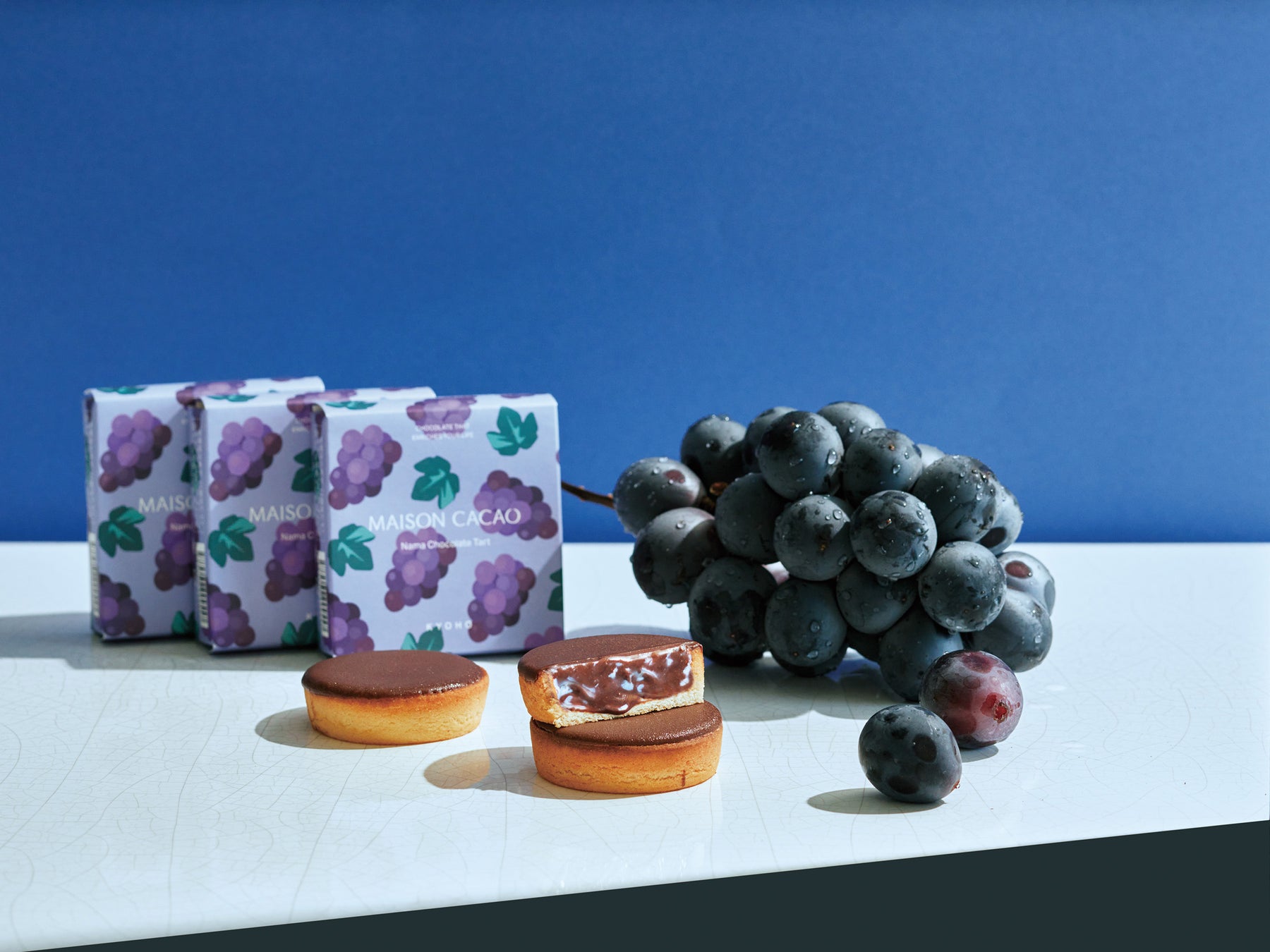 シンプルな美しさにこだわりながらも、味わいと食感を4層で作り込んだ一品です。手焼きのタルト生地に濃厚な巨峰のソースと、コロンビア産の華やかなミルクチョコレートのクリームを流し入れました。最後に表面をコーティングし、香りを閉じ込めています。