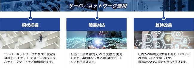 ネットワーク・サーバ機器の保守から見積査定まで、購入ルートに関わらずお客様の情報システム担当に代わって対応。エンジニアを派遣しない、低コストかつハイパフォーマンスなクラウド情シスです。