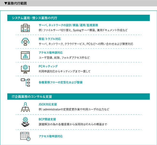 サーバやネットワークの設計 / 構築 / 運用 / 監視業務はもちろん、アクセス権などの申請対応からPCキッティングまで、情シス業務をトータル的にアウトソースできた。