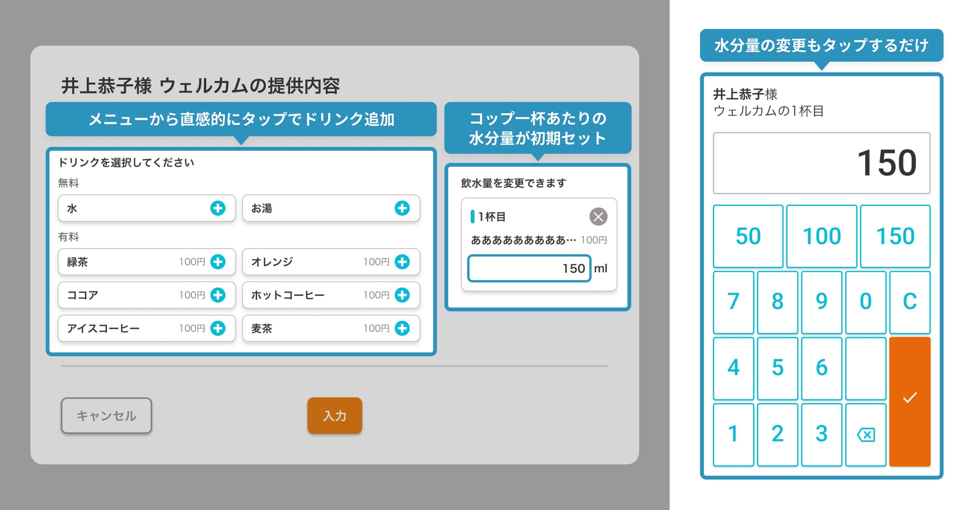 またコップ1杯あたりの水分量が初期セットされ、水分量の変更もテンキーのようなUIで簡単に可能です。