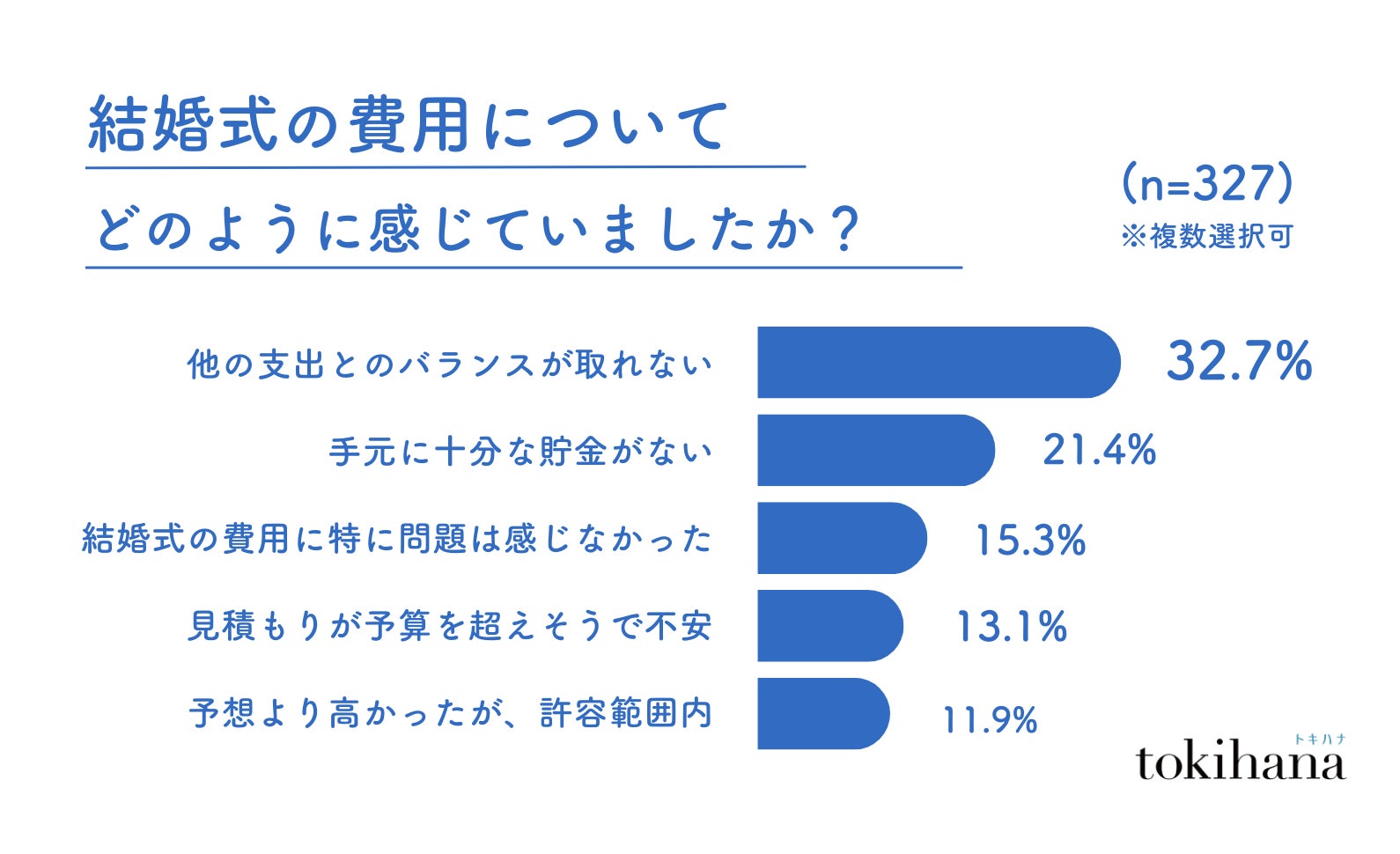 結婚式の費用について感じていたことについては、「費用が高く、他の支出とのバランスが取れない」と回答した人が32.7%、「十分な貯金がなく現実的に無理だと思った」とする人が21.4%にのぼりました。