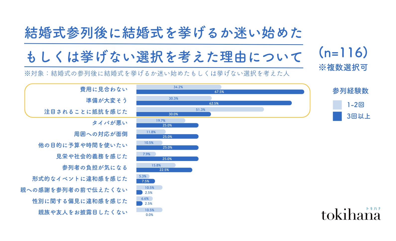 参列回数が増えるにつれ、結婚式を挙げることへの心理的抵抗が現実的な課題と結びつきやすくなると考えられます。結婚式の準備や費用を直に見聞きすることで、従来の「当たり前」とされていた価値観に疑問を抱く傾向が強まっています。