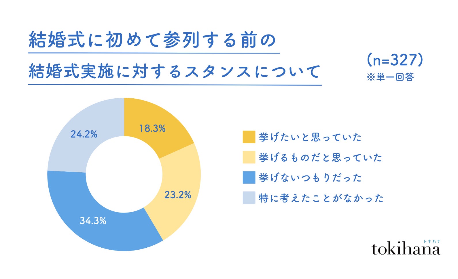 結婚式に初めて参列する前の結婚式の実施に対するスタンスは、「結婚式を挙げたいと思っていた」が18.3%、「挙げたいかに関わらず挙げるものだと思っていた」が23.2%と、4割以上が結婚式を前向きに捉えており、「挙げないつもりだった」の34.3%を上回っています。