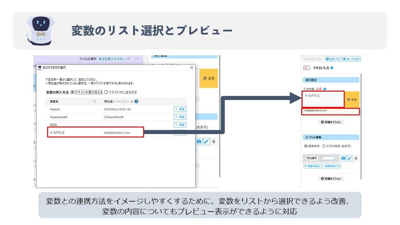 変数との連携方法をイメージしやすくするために、変数をリストから選択できるように改善しました。変数の内容についても、プレビュー表示ができるようになりました。