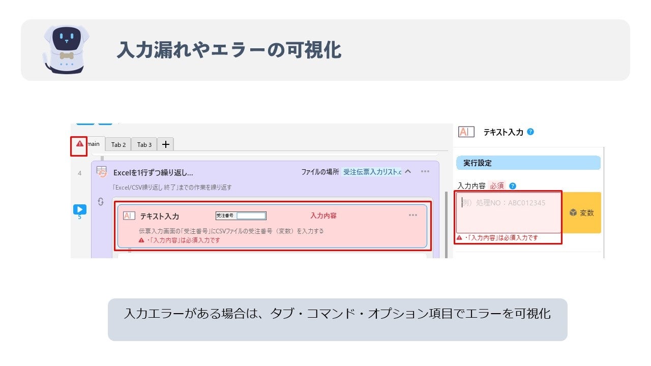 入力エラーがある場合は、タブ・コマンド・オプション項目でエラーを可視化できるようになりました。