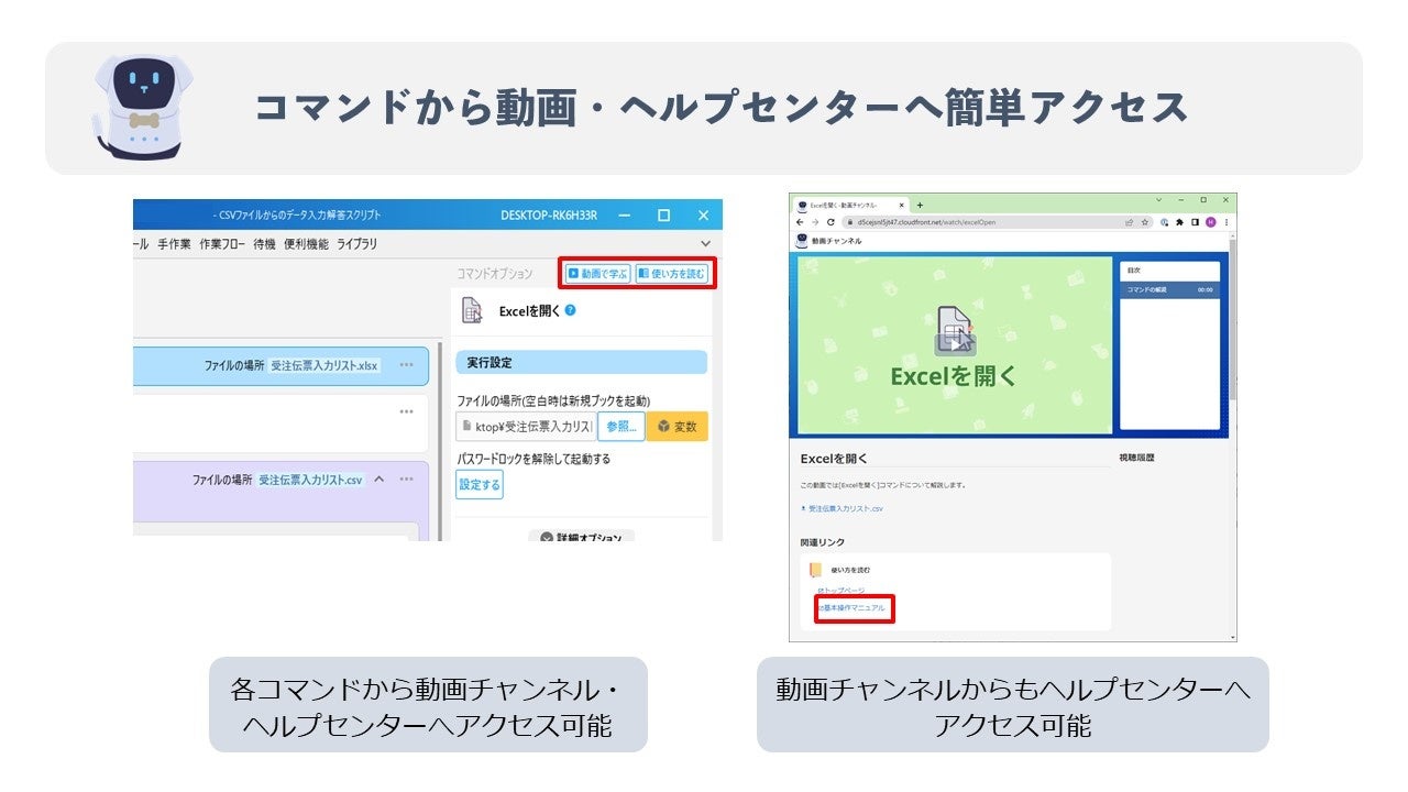 各コマンドから簡単に動画・ヘルプセンターへアクセスすることが可能なため、困った時はすぐに使い方を確認できます。
