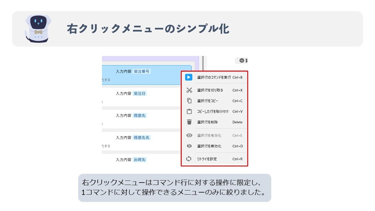 右クリックメニューは、コマンド行に対する操作に限定し、1コマンドに対して操作できるメニューのみに絞りました。