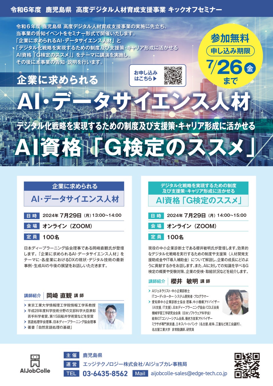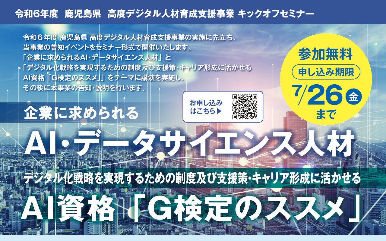 ・キャリア形成に活かせるAI資格「G検定のススメ」」(中小企業診断士:櫻井敏明氏)と題したキックオフセミナーを提供(無料・鹿児島県内企業所属の方は自由参加)。