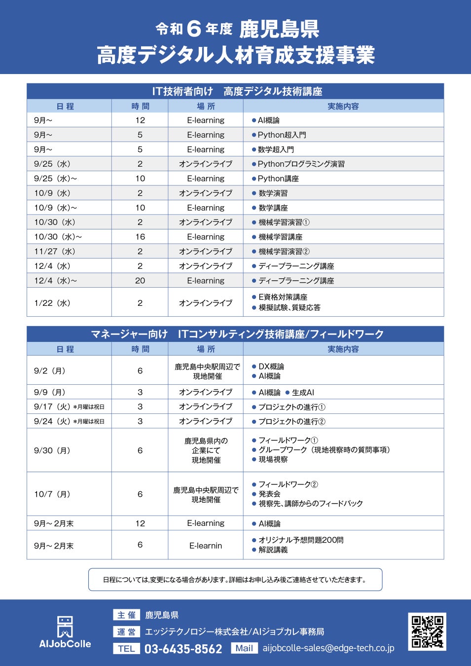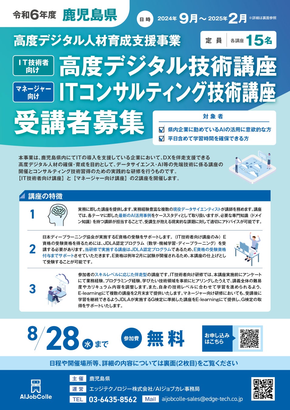エッジテクノロジー株式会社は鹿児島県の委託を受け、DXを伴走支援できる高度デジタル人材の確保・育成を目的とした「高度デジタル人材育成講座」を開催します。