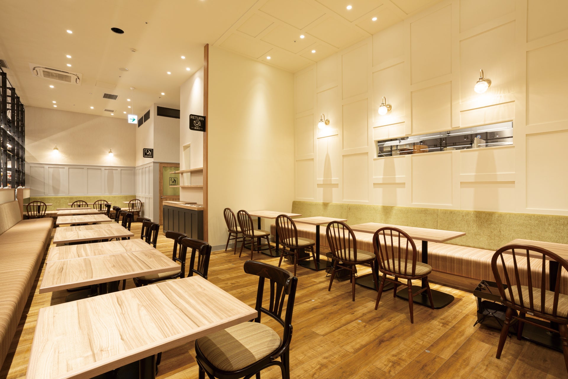 ガラス越しにカウンター席が並んだコーナー。パンとドリンクで気軽にご利用いただけます。各席には電源があり、Wi-Fiも完備しています。おひとりさまでも使いやすく、買い物帰りにふらっと寄って休憩するのにも最適です