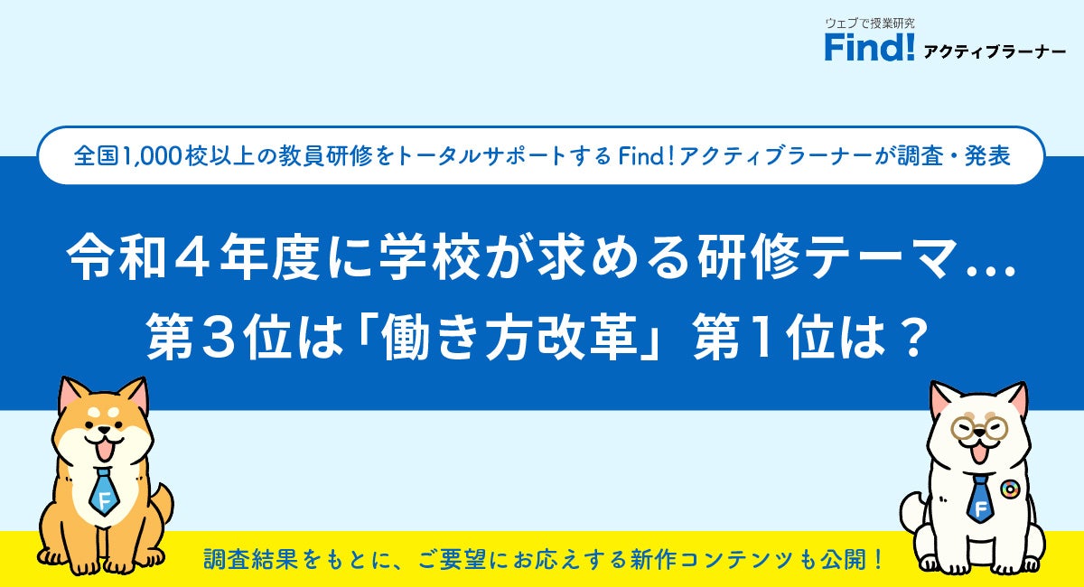 【全国1,000校以上の教員研修をトータルサポートするFind!アクティブラーナーが調査・発表】令和4年度に学校が求める研修テーマ 第3位は「働き方改革」…第1位は?