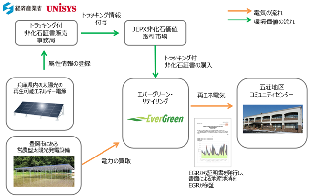 本取組は、EGRが豊岡市にある太陽光発電設備からの再エネ由来の電力(※2非FIT)を買い取り、その電力を豊岡市が所有する施設へ供給することにより、豊岡市での再エネ由来の電力利用比率の向上を目指すものです。また、EGRは、再生可能エネルギー電源にトラッキング付非化石証書を付加することにより、実質再生可能エネルギー比率100%の電力を供給致します。