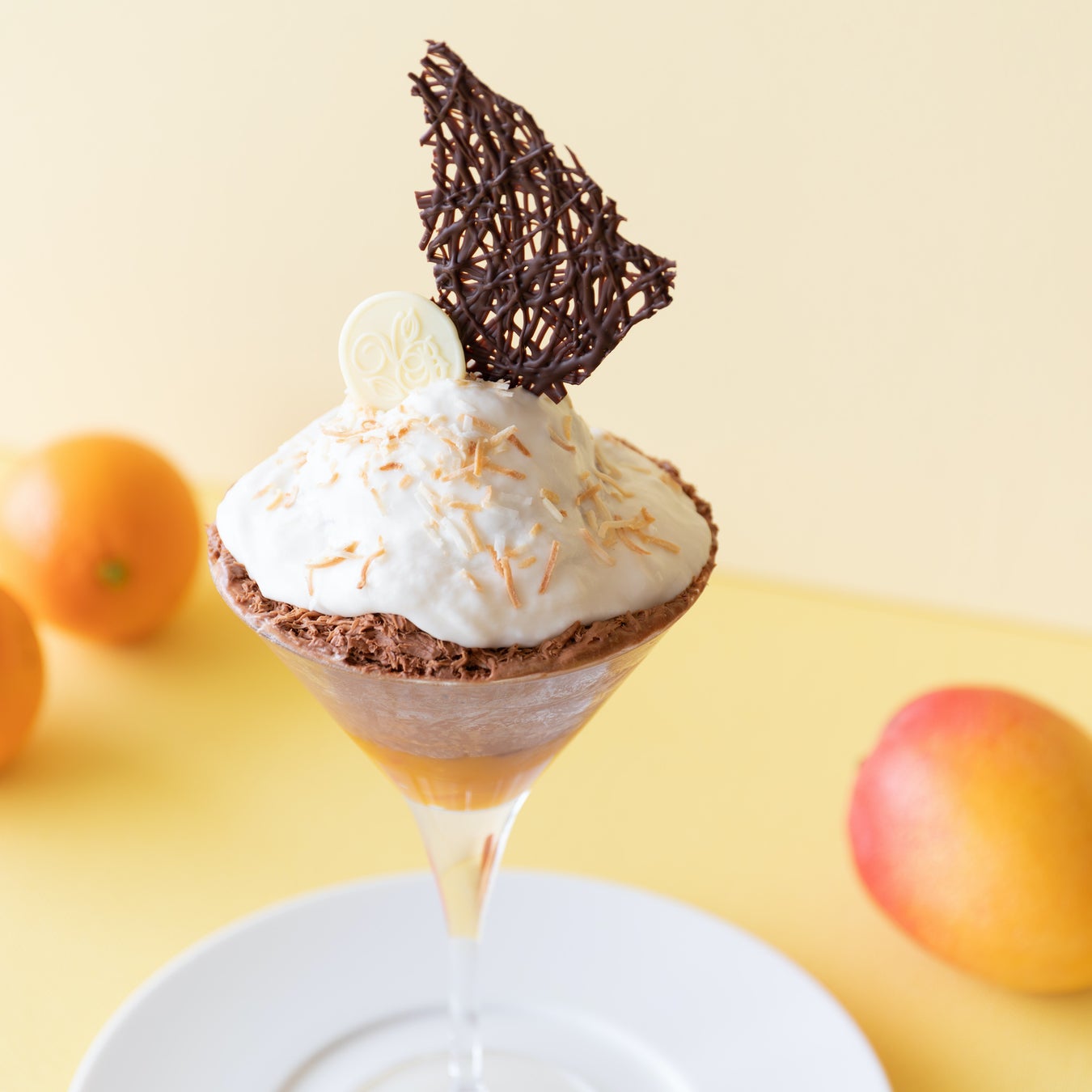 マンゴー&オレンジのコンフィチュールを注いだグラスに、エクアドル産カカオを使ったこだわりのチョコレート氷をやさしく削り、中にはノンホモミルクのアイスを忍ばせました。上からかけるカカオの果肉部分「カカオパルプ」を使用したふわっととろけるエスプーマ(泡状のムース)と一緒にご堪能ください。